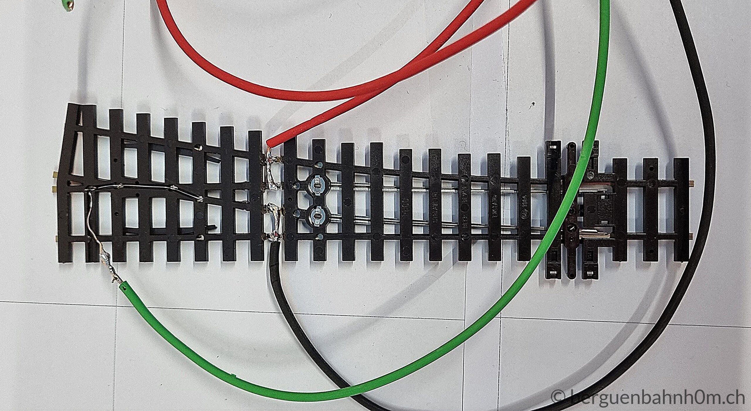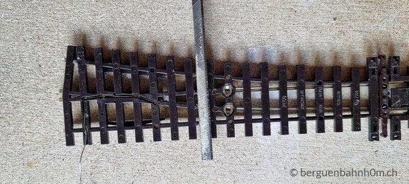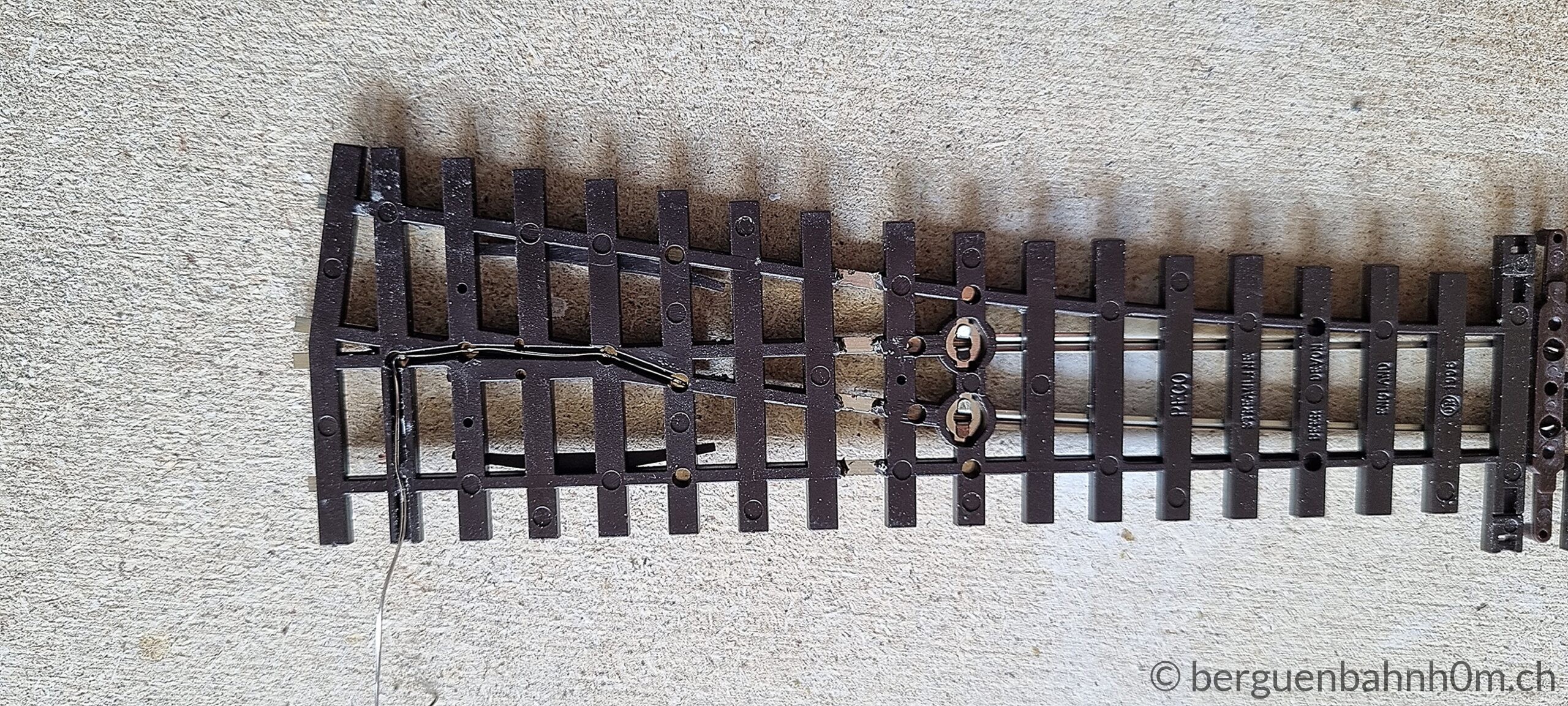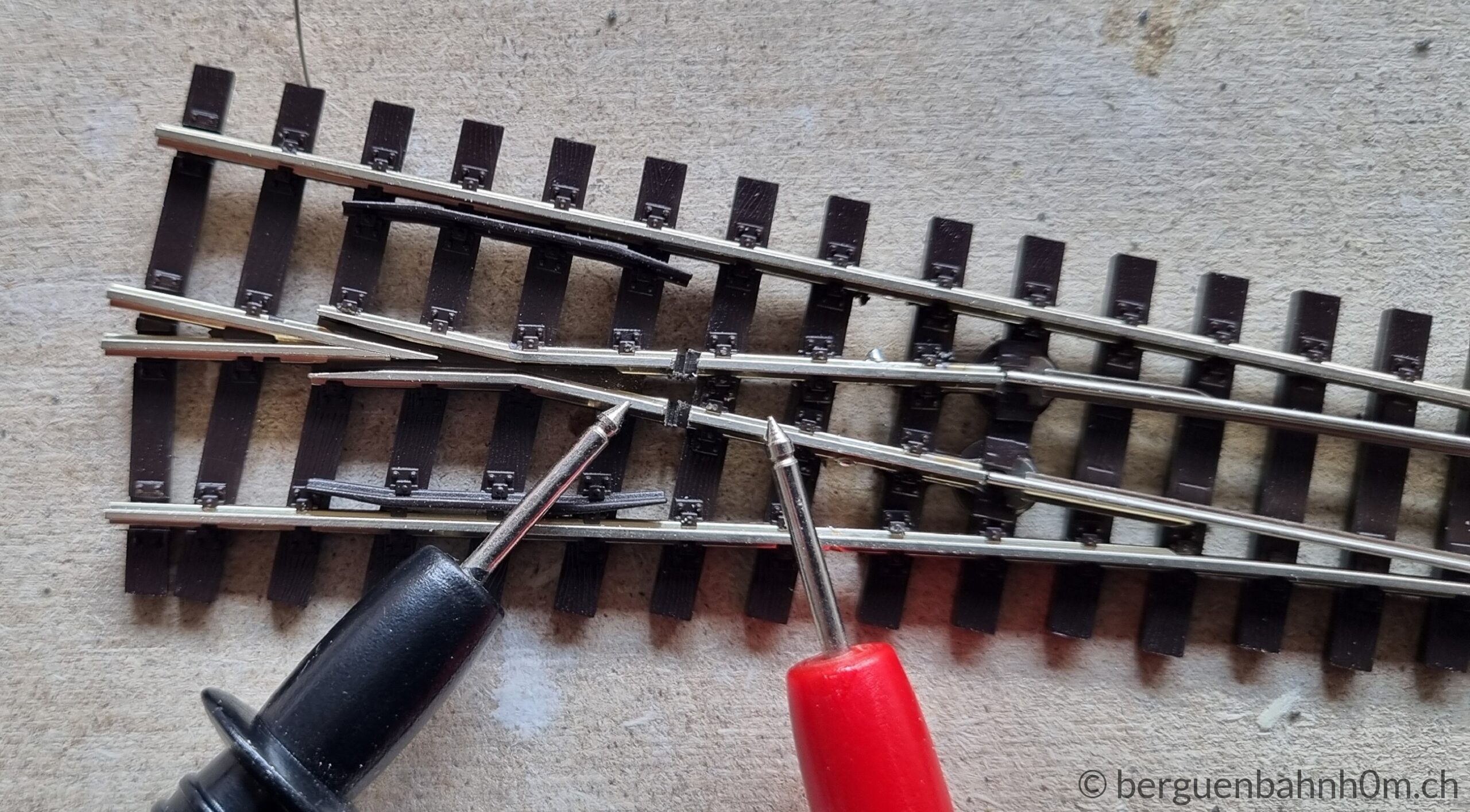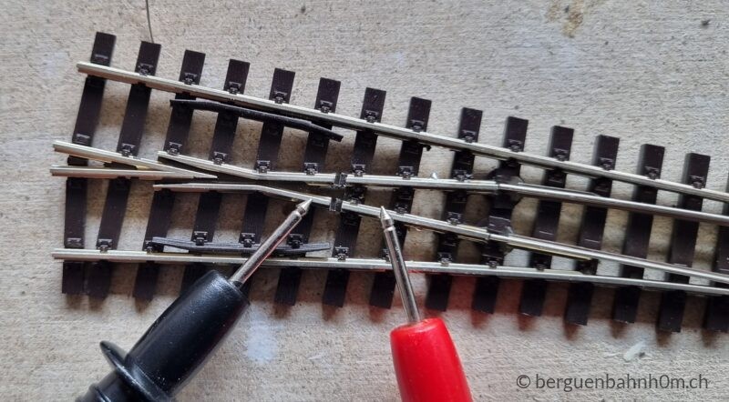 Am Herzstück einer Weiche treffen entgegengesetzte Polaritäten aufeinander – wer das ignoriert, erlebt Kurzschlüsse statt Fahrspass. Peco-Weichen lösen das ab Werk über die Zungen, doch Oxidation und Rost setzen den Kontakten mit der Zeit zu. Die zuverlässigere Lösung ist die direkte Stromversorgung über die ESU SwitchPilot Extension: Dieser polarisiert automatisch, synchron mit dem Weichenantrieb – kein Kurzschluss, kein Ruckeln. Abschliessend Pflicht: Jede Lötstelle per Durchgangstest prüfen und den Schlusstest nicht vergessen.
