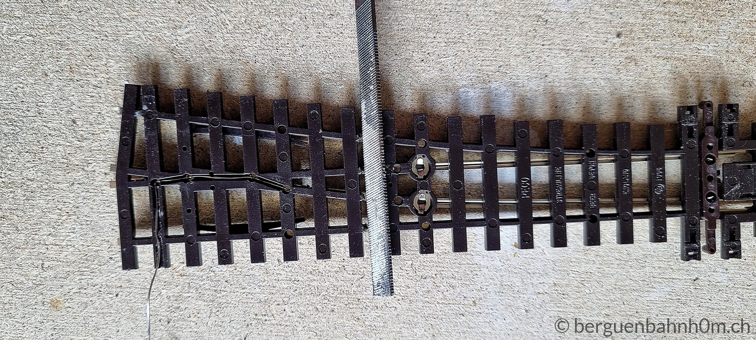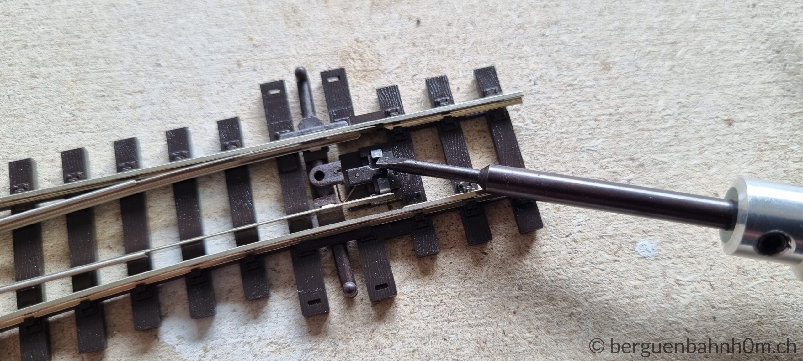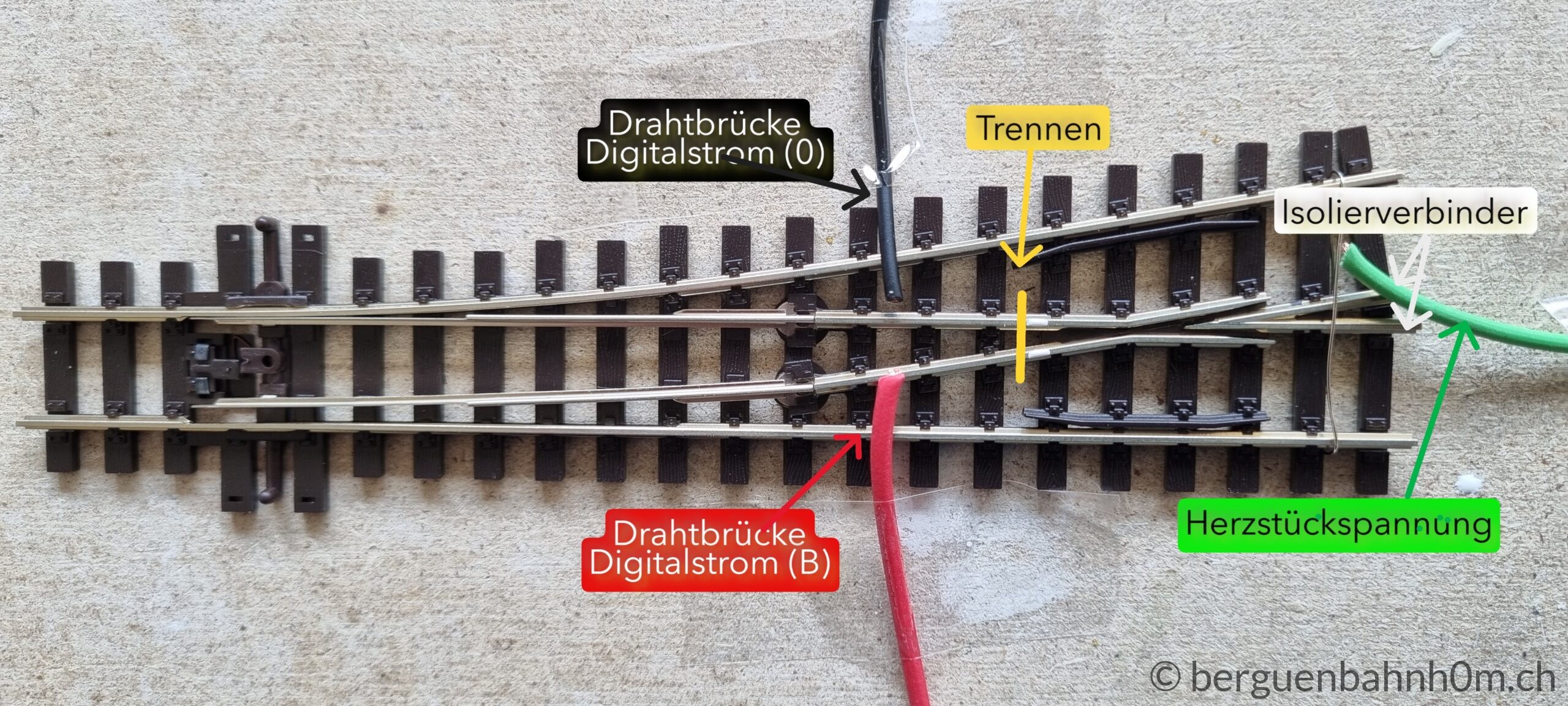 Am Herzstück einer Weiche treffen entgegengesetzte Polaritäten aufeinander – wer das ignoriert, erlebt Kurzschlüsse statt Fahrspass. Peco-Weichen lösen das ab Werk über die Zungen, doch Oxidation und Rost setzen den Kontakten mit der Zeit zu. Die zuverlässigere Lösung ist die direkte Stromversorgung über die ESU SwitchPilot Extension: Dieser polarisiert automatisch, synchron mit dem Weichenantrieb – kein Kurzschluss, kein Ruckeln. Abschliessend Pflicht: Jede Lötstelle per Durchgangstest prüfen und den Schlusstest nicht vergessen.