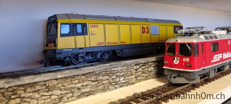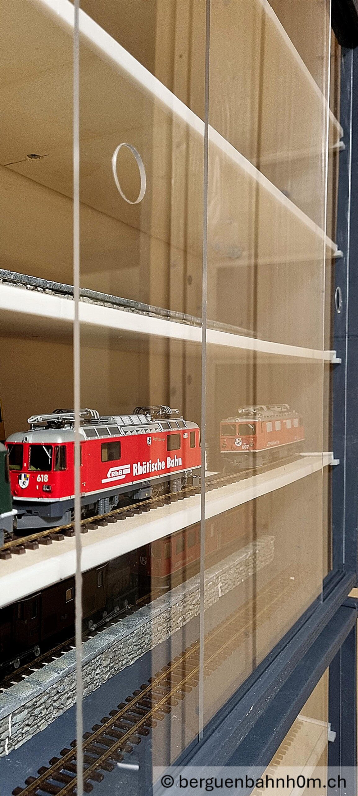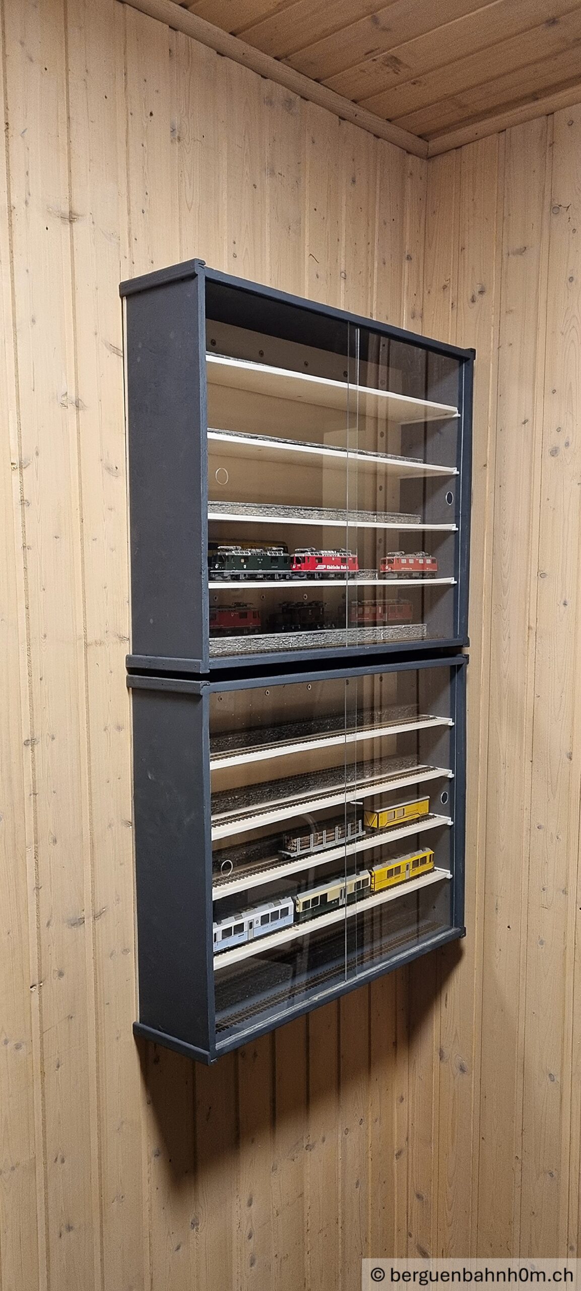 Wer sammelt, braucht Ordnung. Wer Ordnung will, braucht Vitrinen. Also: bauen! Der Rahmen: Pappel-Sperrholz, 10 Millimeter. Schlicht, solide — mehr braucht es nicht. Vier Einlegeböden mit je zwei Gleise auf unterschiedlichen Niveaus. Die Modelle stehen, wie es ihnen zukommt: sichtbar, staubfrei, griffbereit. Die Front bilden zwei Schiebescheiben in Führungsschienen aus dem 3-D-Drucker. Die Vitrinen sind fertig. Die Sammlung kann wachsen und die RhB einfahren 😉