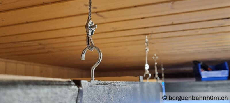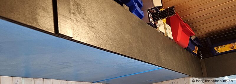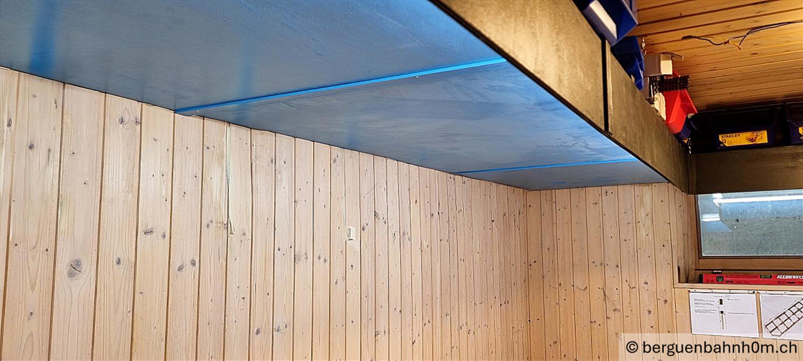 Hellblau ist mehr als nur eine Farbe – es ist eine bewusste Wahl: ruhig genug, damit die Anlage im Mittelpunkt steht. Davor sitzt die schwarze Blende wie ein Rahmen. Dann kommt das Licht: LED-Streifen sollen die Anlage tageshell ausleuchten. Die aktuell montierten sind leider zu schwach – da braucht es mehr Lumen. Sobald der Modellbahnhintergrund geliefert und montiert ist, muss deshalb eine neue stärkere Beleuchtung her.